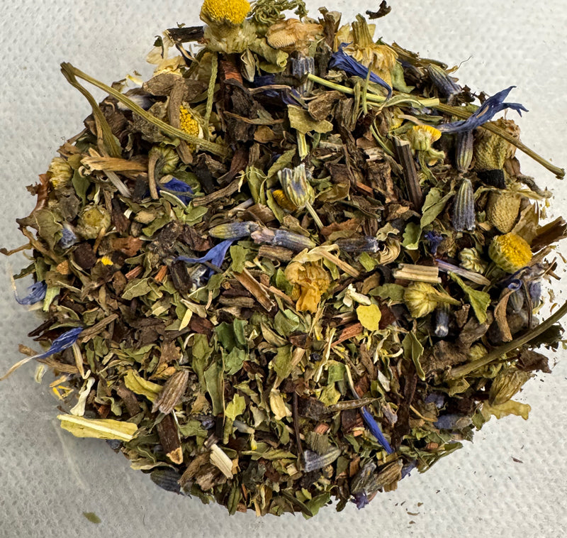 Blended with valerian root inclusion, honeybush tea, chamomile flowers, spearmint leaves, passion flower, lemon balm, lavender flowers, dried cherries & blue cornflowers.